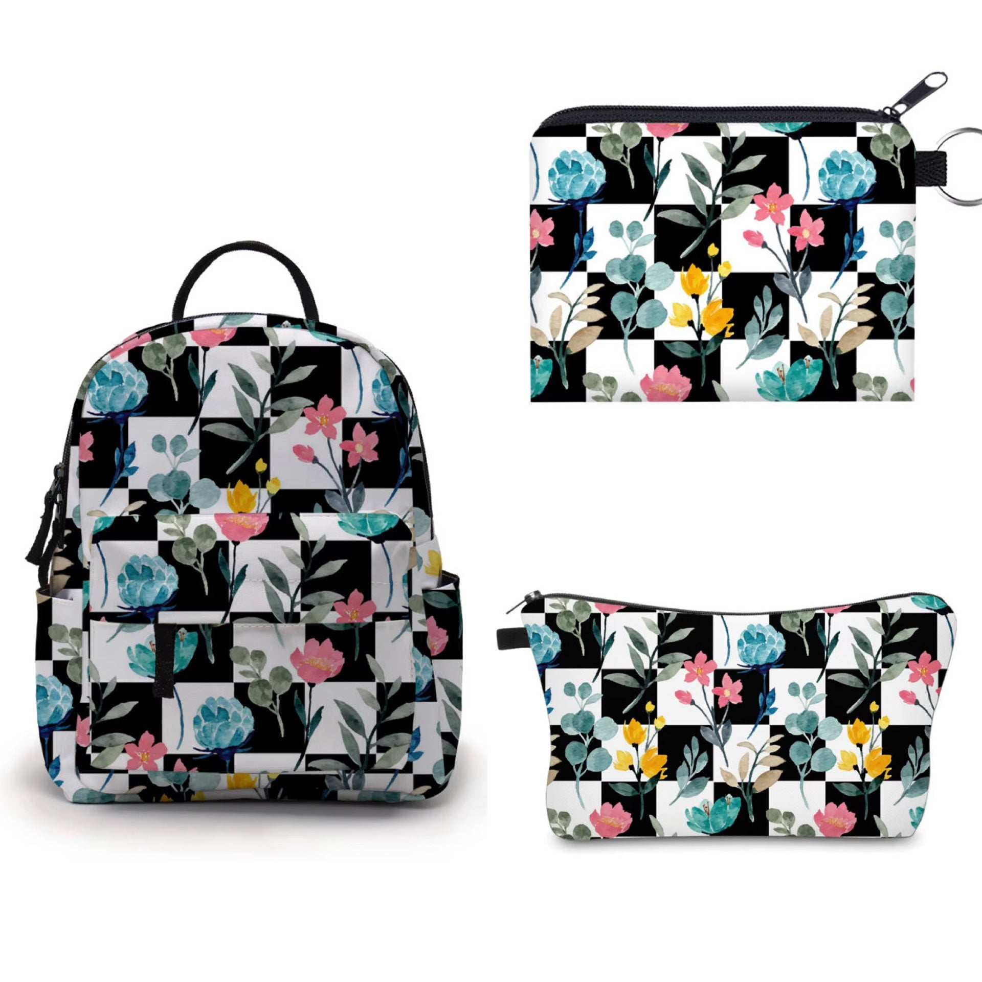 Mini Backpack, Pouch, & Mini Pouch Bundled Set - Floral Checker