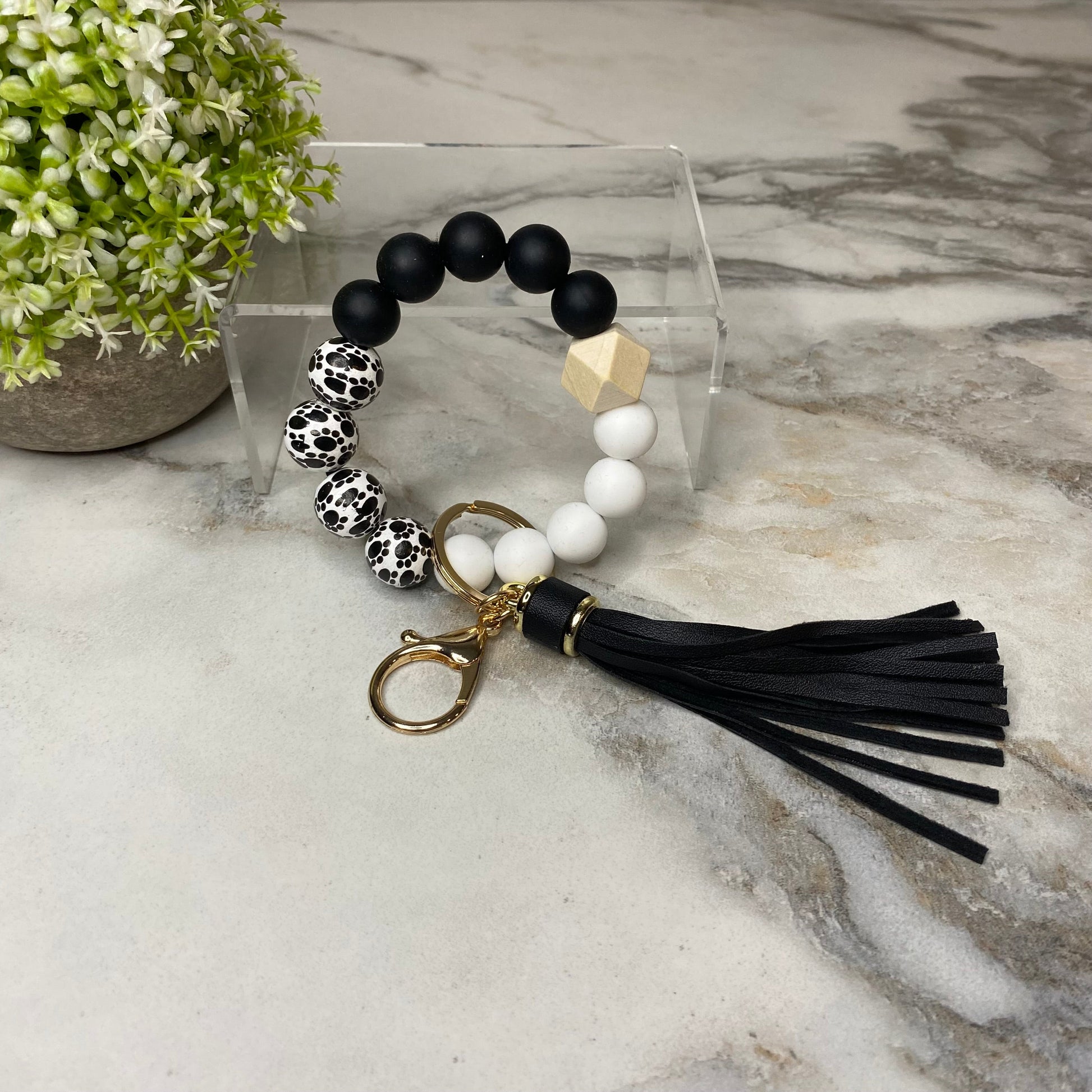 Silicone/Wood Bracelet Keychain - Paw - Black